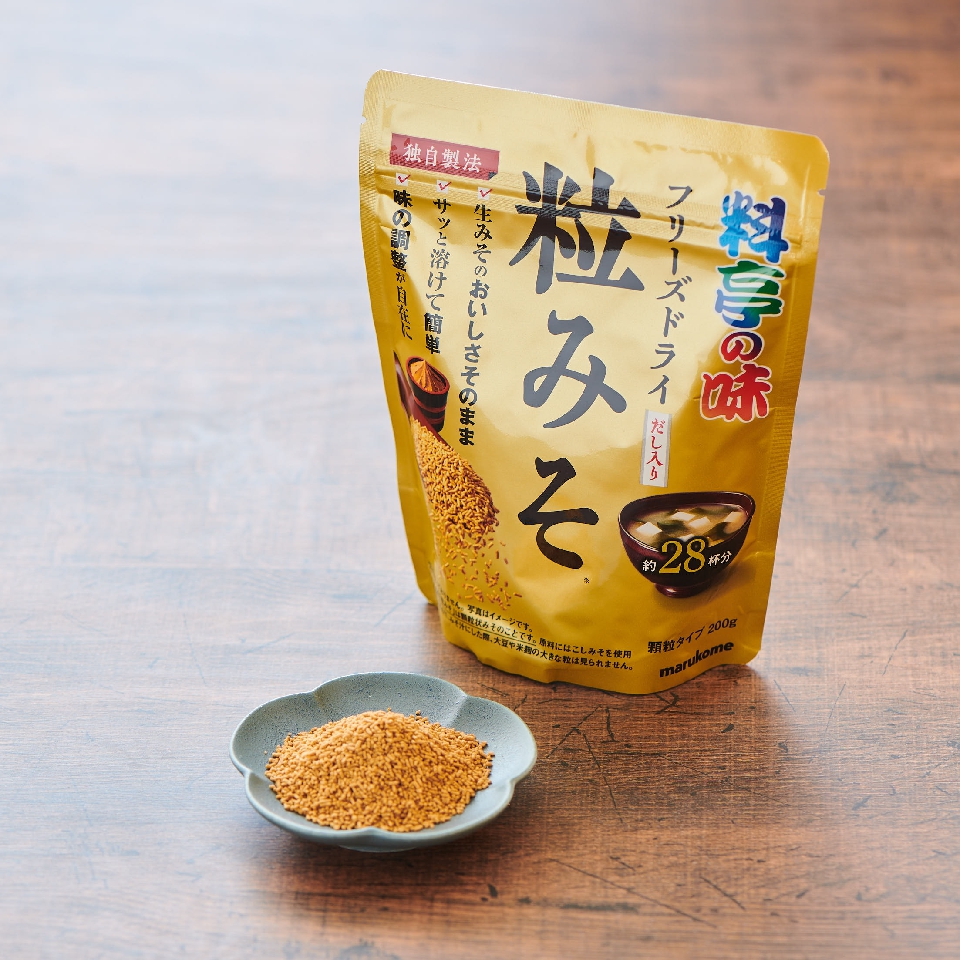 「料亭の味 フリーズドライ 粒みそ」(以下【粒みそ】)は、多くの人に愛され続けているだし入りみそ「料亭の味」を、独自製法でフリーズドライ加工した粉末みそ。でも従来の粉末みそとは違い、風味が変わる間も無く一瞬でフリーズドライ加工していますので、みそ本来の風味がぎゅっと凝縮されているのが大きな特長です。