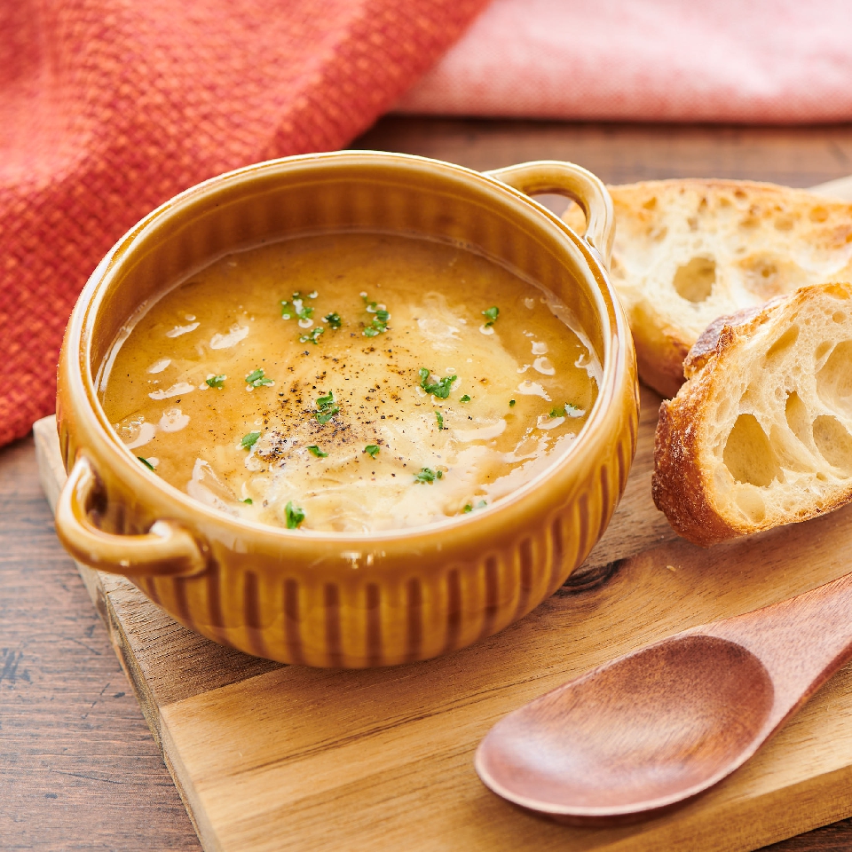 オニオン×チーズ×【粒みそ】=和洋どちらにも合う「粒みそオニオングラタンスープ」
