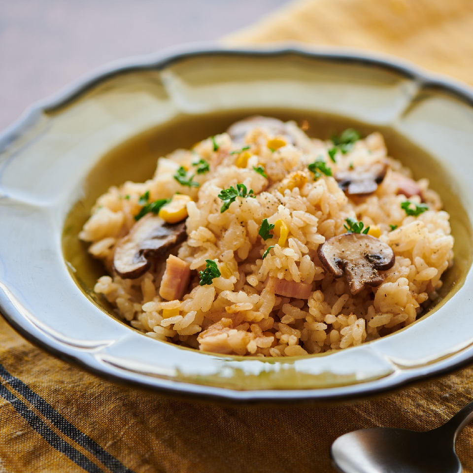 洗ったお米に分量の水、炒めたマッシュルーム、玉ねぎ、ベーコン、コーンと、ご飯1合につき大さじ1くらいの【粒みそ】を入れて、炊飯器で炊きます。炊きあがったらバターを混ぜて、食べる直前にブラックペッパーを振りましょう。