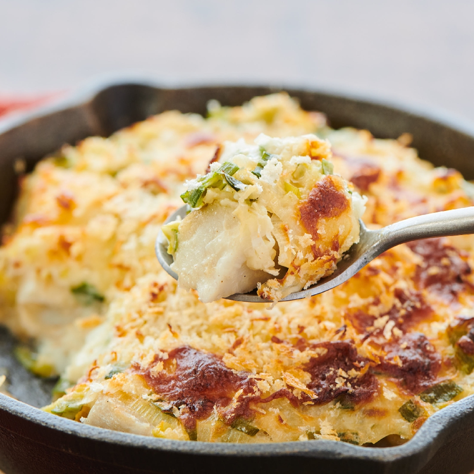 長ネギを薄く輪切りにし、バターで炒めて小麦粉、牛乳を加え、ホワイトソースを作ります。コンソメの代わりに粒みそを入れて味を整えたら、電子レンジ加熱した里芋と、バターで軽く焼いた鱈を耐熱容器に並べ、そこにも粒みそをぱらぱらとかけます。その上に長ネギのホワイトソース、シュレッドチーズ、パン粉を乗せて、オーブンでこんがり焼き色が付くまで焼いたらできあがり。