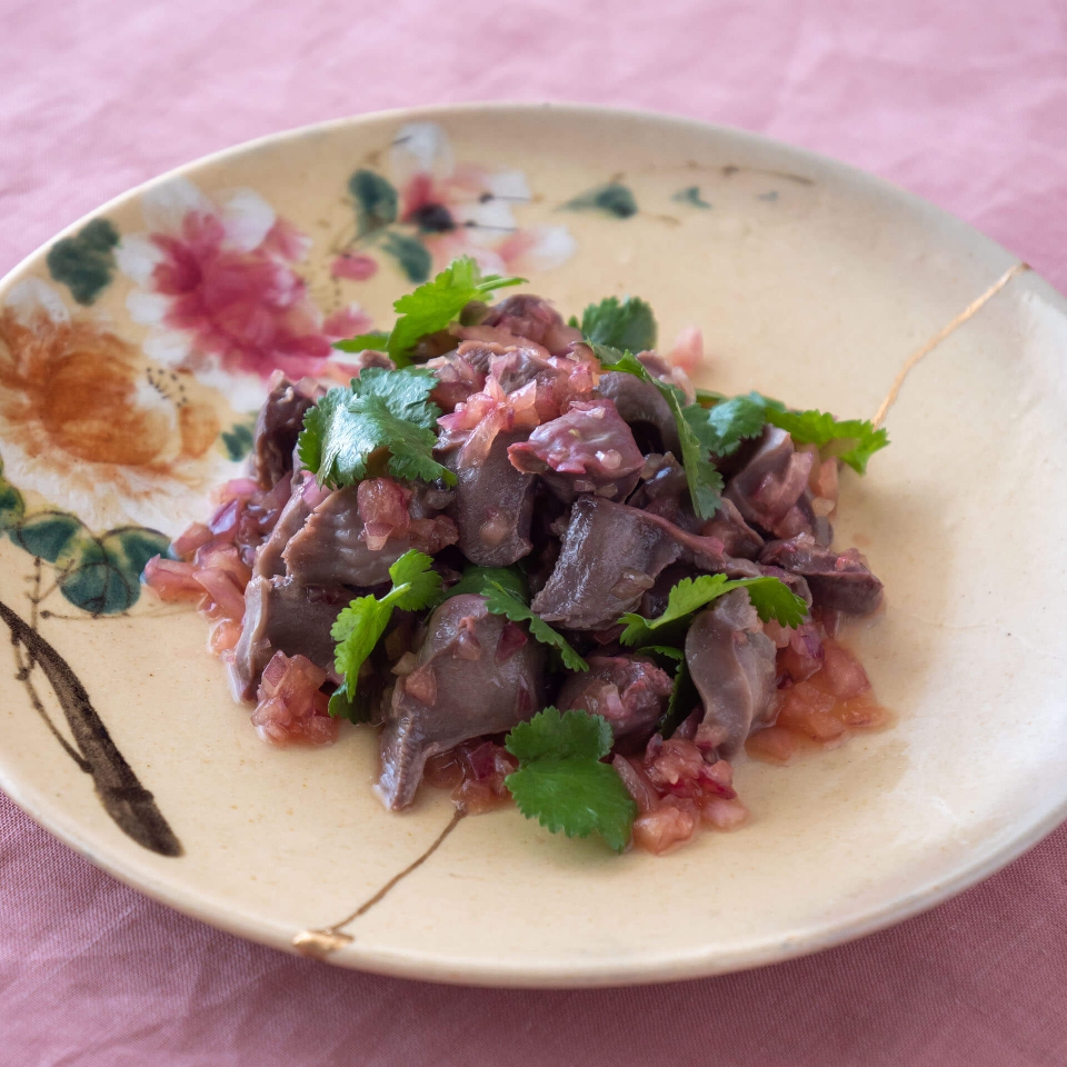 赤玉ねぎは水にさらしてから、水気をよく切って、梅酢、醤油、砂糖、ごま油と合わせておき。さらに、鍋に梅酢を少し入れて茹でた砂肝を入れ、味を馴染ませるようによく混ぜ合わせたら、最後にパクチーを入れサッと混ぜて完成です。