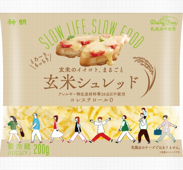 「玄米シュレッド」は、国産の玄米粉を使用した新しいプラントベースのチーズです。乳製品のチーズと同じように、加熱してピザトーストやチーズフォンデュにして楽しむことができ、またそのままサラダのトッピングにも使えます。