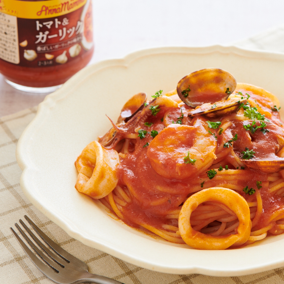 母の日のご馳走メニューにぴったりなペスカトーレも、「アンナマンマ トマト&ガーリック」を使えば、驚くほど簡単です。ガーリックのきいたトマトソースに、蒸し煮した魚介の濃厚なだしが溶け込んで、悶絶するほどの美味しさ!