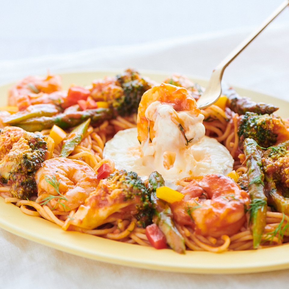 トロトロに溶けたカマンベールにお野菜やエビをディップ、最後はパスタにチーズをからめて食べる、満足度の高い一皿です。ワインを傾けながら、家族みんなでワイワイ食べるのも楽しそう。豪華な見た目ですが、エビと野菜を炒めたら、「アンナマンマ トマト&ガーリック」を入れるだけなので、とても簡単です♪