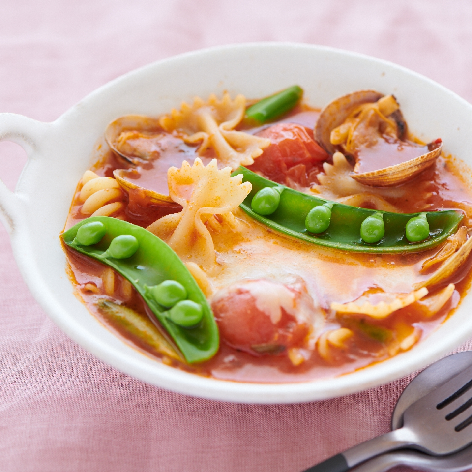 スナップディッシュレシピ①…ボリュームたっぷりで華やか「アサリのごちそうスープパスタ」