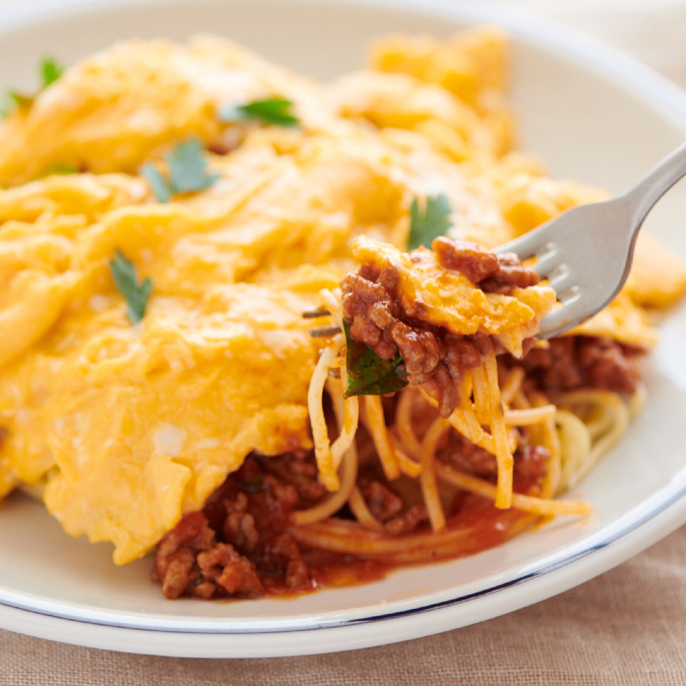 トロトロのチーズオムレツに、バジルが香るボロネーゼソースのパスタをからめながら食べる、みんなが笑顔になる料理です。挽肉たっぷりで食べ応えがあるので、お肉好きの家族も大満足。ボロネーゼソースは時間がかかるイメージがありますが、「アンナマンマ トマト&バジル」を使えば時短で完成します。