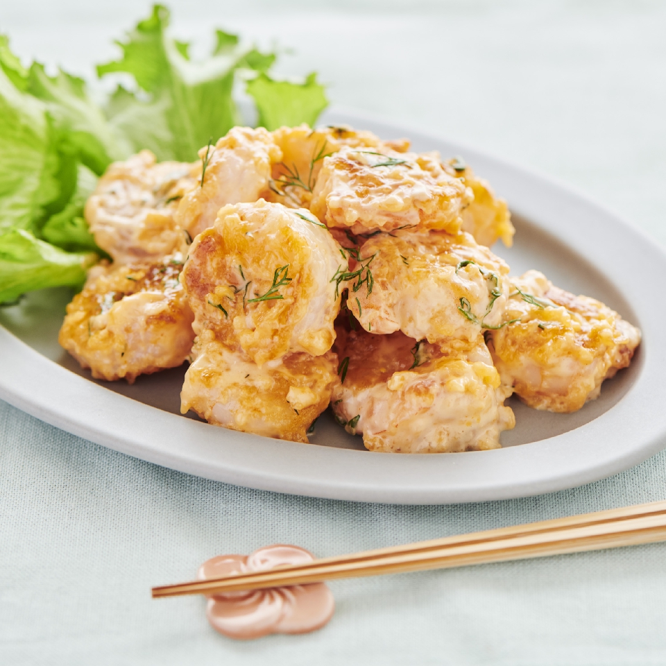 下処理をしたエビに塩糀パウダーをまぶし、その間にマヨネーズ、ケチャップ、砂糖、レモン汁を合わせておきます。エビに片栗粉をまぶし、油を引いて熱したフライパンで焼いたら調味料を絡ませて完成。お好みでディルを散らすのもおすすめです。