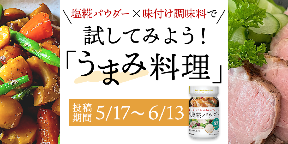 2024年6月16日からは、投稿キャンペーン『試してみよう!「うまみ料理」』キャンペーンもスタート。素材のコクとうまみを引き出す 塩糀パウダー×味付け調味料の新たな組み合わせからから生まれるオリジナル「うまみ料理」の投稿をお待ちしています。