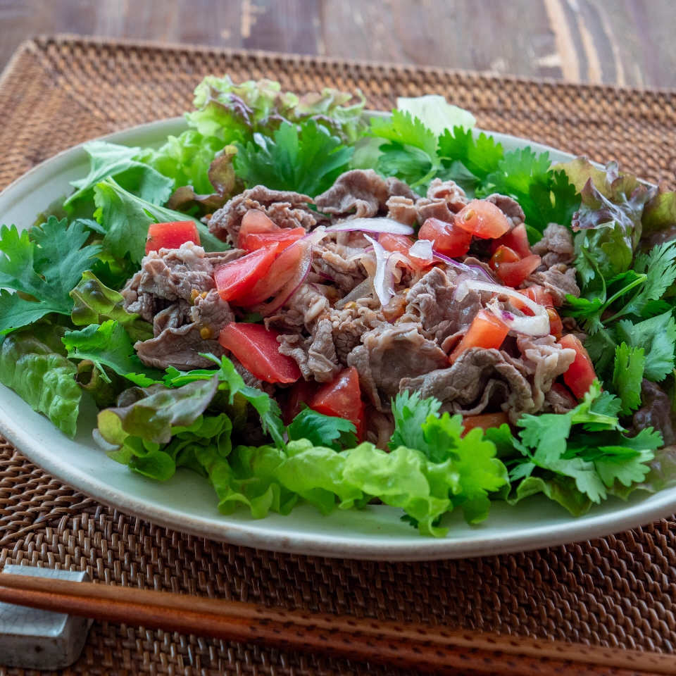 牛薄切り肉を使ったサラダ、紫玉ねぎ、パクチー、サニーレタスを合わせて。ざく切りにしたトマトは「青こしょう醤油」、魚醬、レモン汁、砂糖、ごま油と和えてドレッシング代りになります。