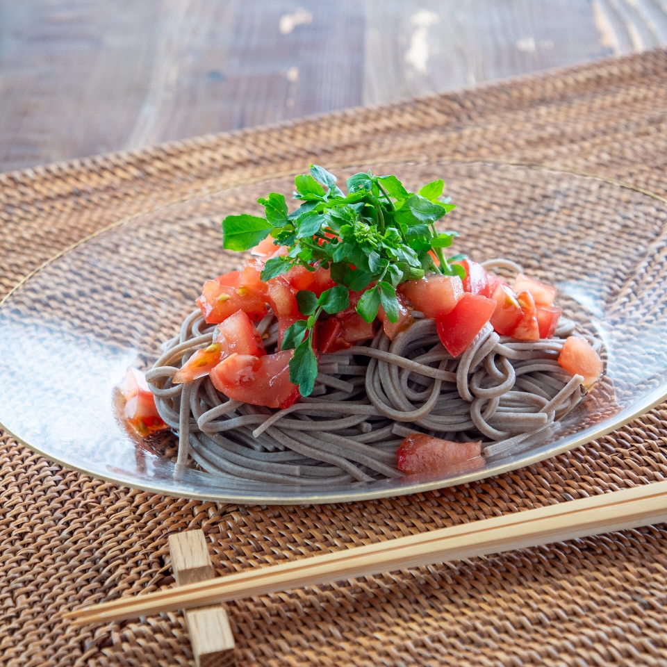 お蕎麦の上にトマトダレとクレソンを乗せて出来上がり!