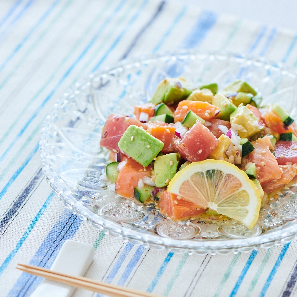 サーモン、まぐろ、アボカドは大きさを揃えて一口大に、キュウリは細かく、赤玉ねぎは粗いみじん切りにカットします。塩・レモン汁・日の出新味料・ごま油・醤油を入れて混ぜ、最後に白ごまをかけて完成です。