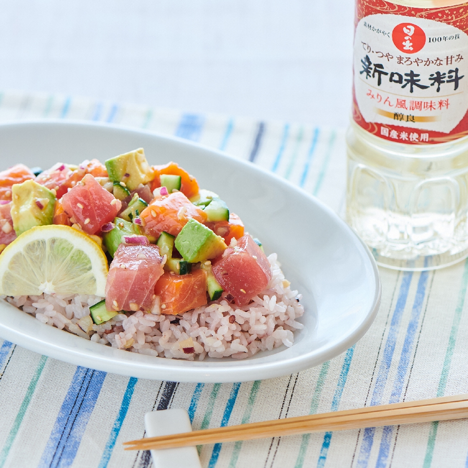 ごはんと合わせてポキライスにするのもおすすめ。雑穀米と合わせるとヘルシーなだけじゃなく、食感に変化がつき、見た目もオシャレです。