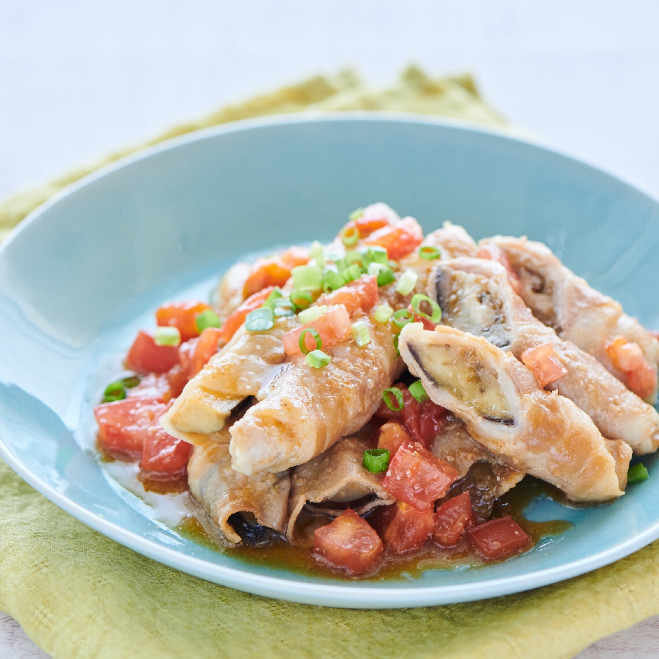 レンチン調理でもしっかりしたコク…【茄子の豚肉巻き生姜トマトダレ】
