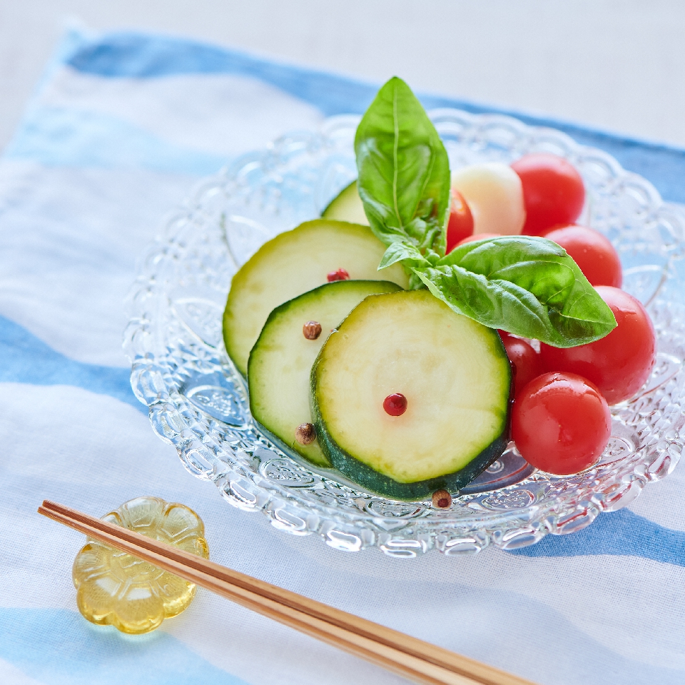 日の出新味料、水、米酢、塩、にんにく、唐辛子、お好みのスパイスを合わせて漬け汁を作り、輪切りにしたズッキーニを入れ、レンジで3分程度加熱。粗熱が取れたら、ミニトマトとフレッシュバジルの葉を入れ、冷蔵庫で30分~1時間程度冷やします。スパイスはホールのブラックペッパーやピンクペッパーなど、お好みで。