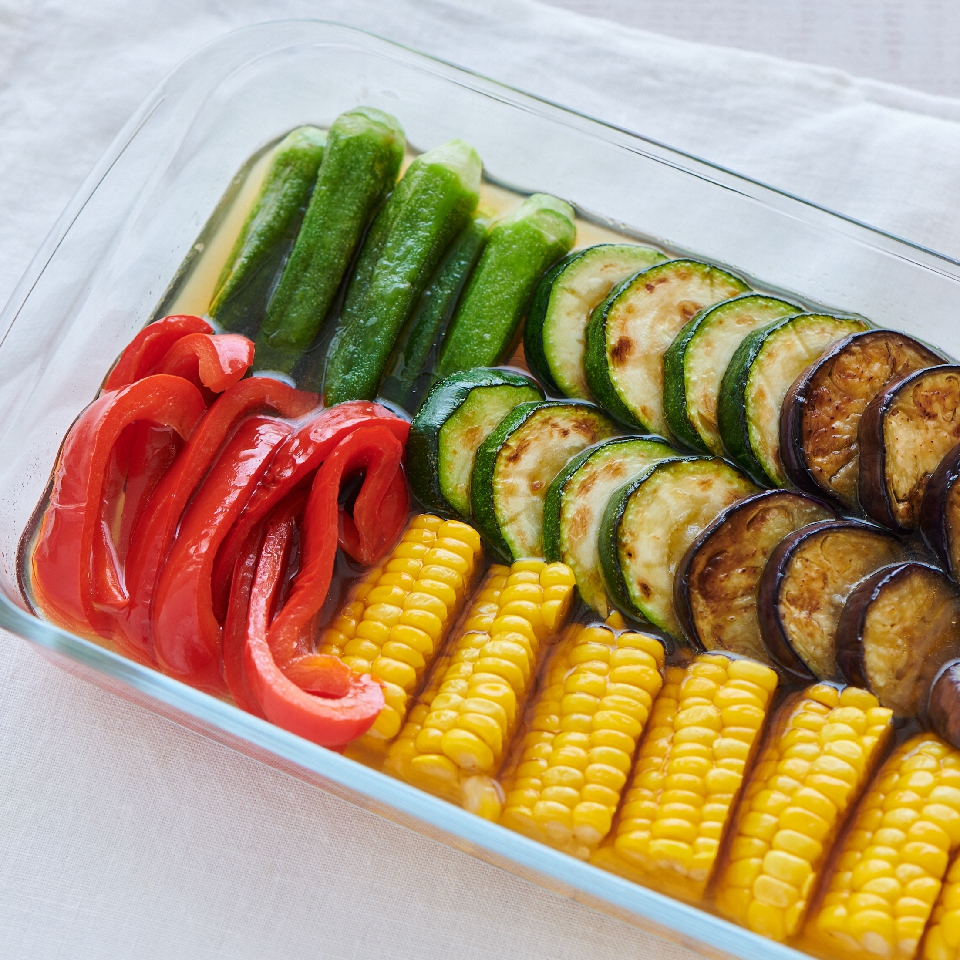 茄子、赤パプリカ、オクラ、ズッキーニ、トウモロコシなどの夏野菜はお好みの油で焼き、日の出新味料、白だし、醤油を合わせたつゆに漬け込んで、冷蔵庫で冷やします。