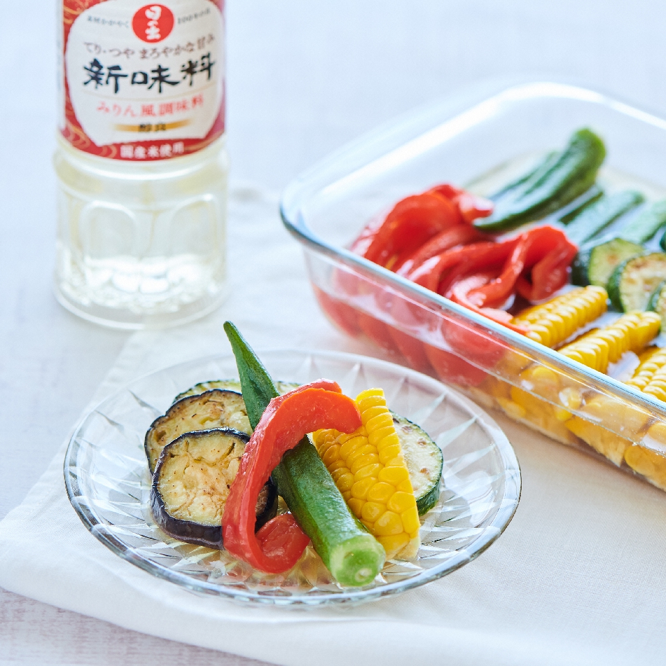 焼き浸しはよく作る方が多いと思いますが、日の出新味料を加えるとコクが一気にアップ。自然な甘みの、飲み干したいほど美味な漬け汁になります。仕上がりにツヤが出てよりおいしそうに見えるのも嬉しい。煮切らなくていいので、残り野菜で気軽に作れます。