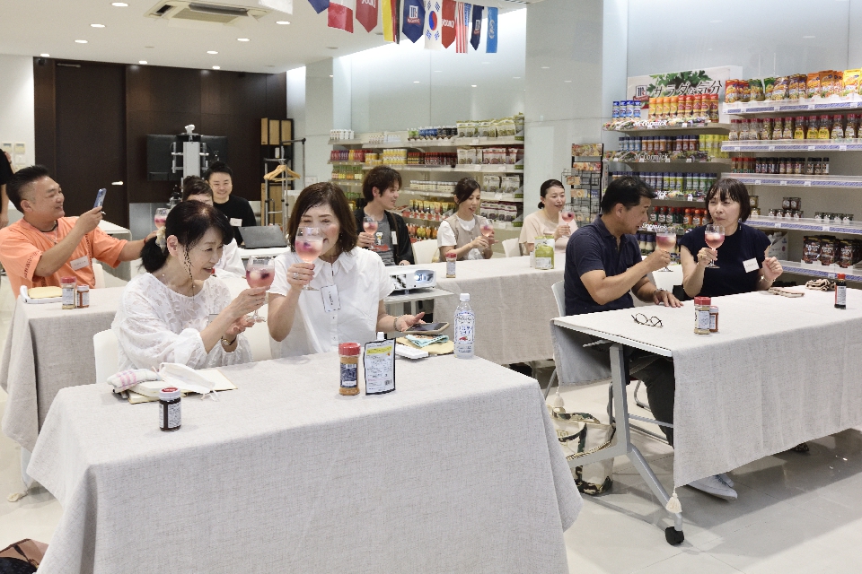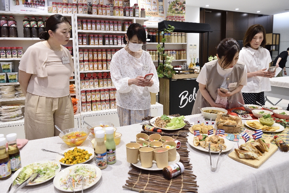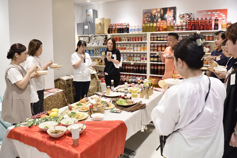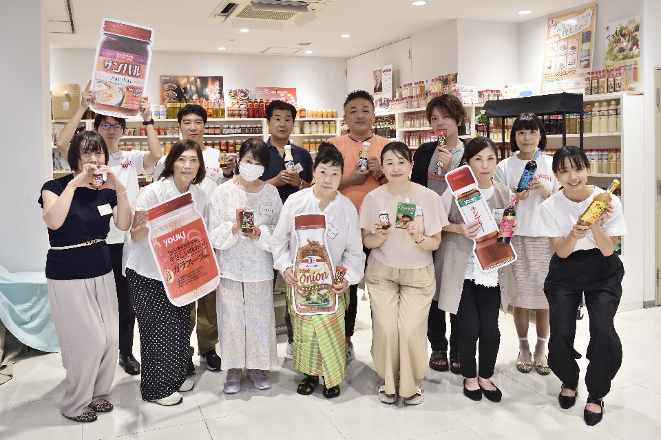 「お疲れ様会」会場は、たくさんのユウキ食品さんの商品が並ぶショールーム。お料理好きのパートナーさん達もワクワクがとまりません!
