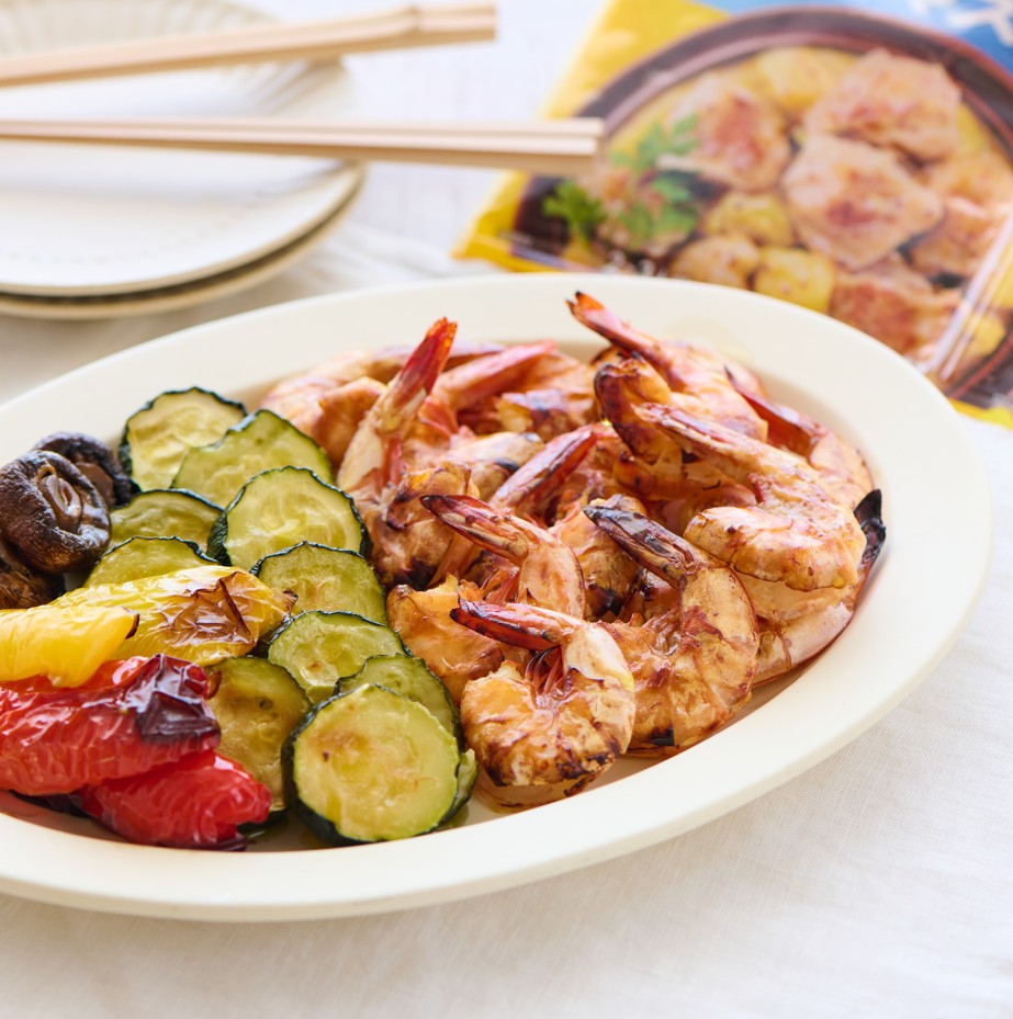 背中を開いて、【メインディップ 鶏ももポテトのハニーマスタード】に漬け込んでおいた殻付きのえびと、季節の野菜をオーブン焼きにするだけ。簡単なのに見た目が豪華でごちそう感がありますので、おもてなしの一品にもおすすめです。殻付きのほうが香ばしく仕上がりますが、食べやすいむきえびでもOK。
