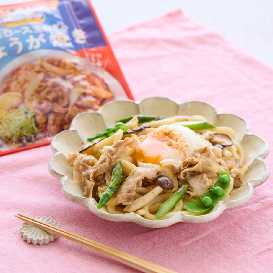 【メインディップ 豚ロース玉ねぎのしょうが焼き】に漬け込んでおいた豚バラ肉とお好みのお野菜、茹でうどんを炒めるだけで完成。メインディップ以外の味付けはほぼ不要、お好みで塩・こしょうを仕上げに振る程度。あっという間にでき、野菜もお肉もたっぷりとれます。温泉卵をトッピングすれば、味も栄養もご馳走っぽさもぐっとアップ♪