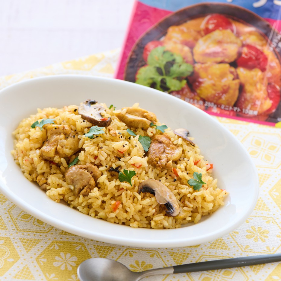 疲れている時でもササッと作れて、これ一品で主食と主菜になる、お助けメニューです。ただ炊いただけとは思えない、プロが作ったような仕上がり。スパイスの香りで食欲が進みますが、辛味はほとんどないので、家族みんなでおいしく食べられます。お米をパスマティライスにすれば、ビリヤニに!