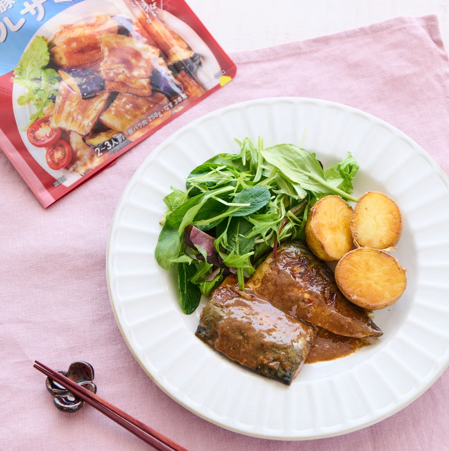 【メインディップ 豚バラなすのバルサミコ炒め】に漬け込んでおいたサバを、フライパンで焼くだけ。サバの味噌煮よりも断然ラクで、いつものサバがフレンチレストランの一皿のようなオシャレな味付けに。