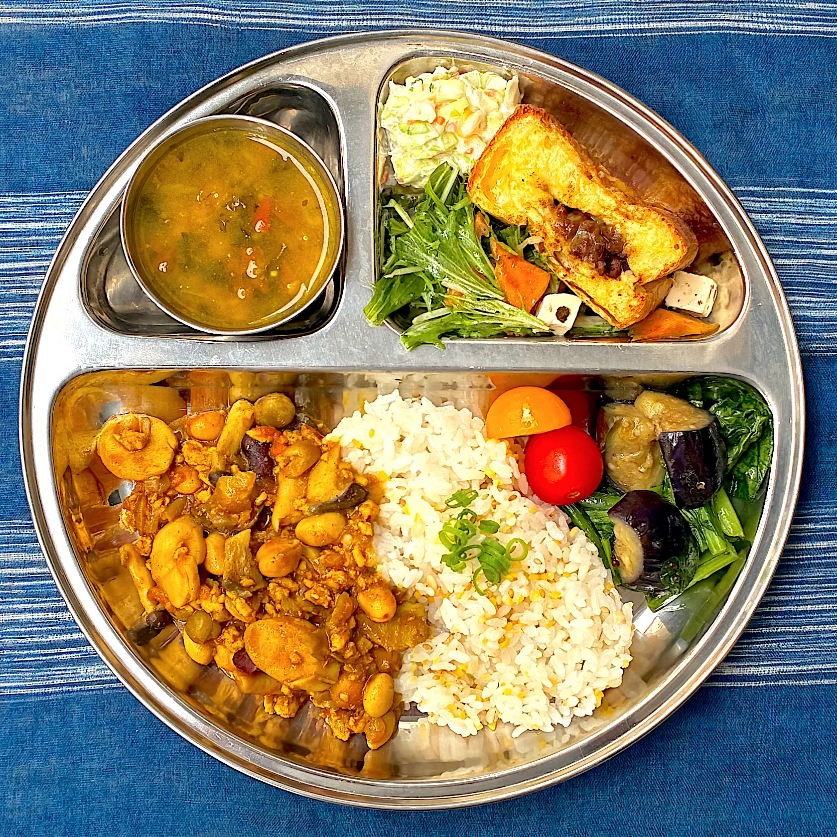 左はメティ・ダル(メティ風味の豆カレー)、栃尾揚げの手前のサラダにはお隣さんからいただいた柿を和えてみました。甘くて美味しい♪