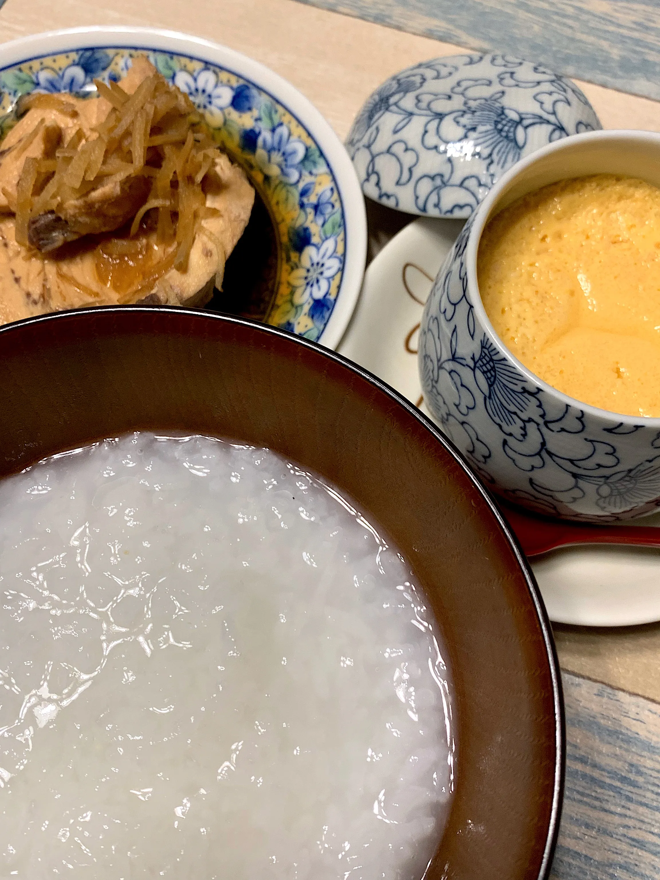 明日が大腸内視鏡検査なので夕飯を病院から頂いた表に従って作りました。お粥、豆腐入り茶碗蒸し、かじき煮です。#お腹に優しい食事