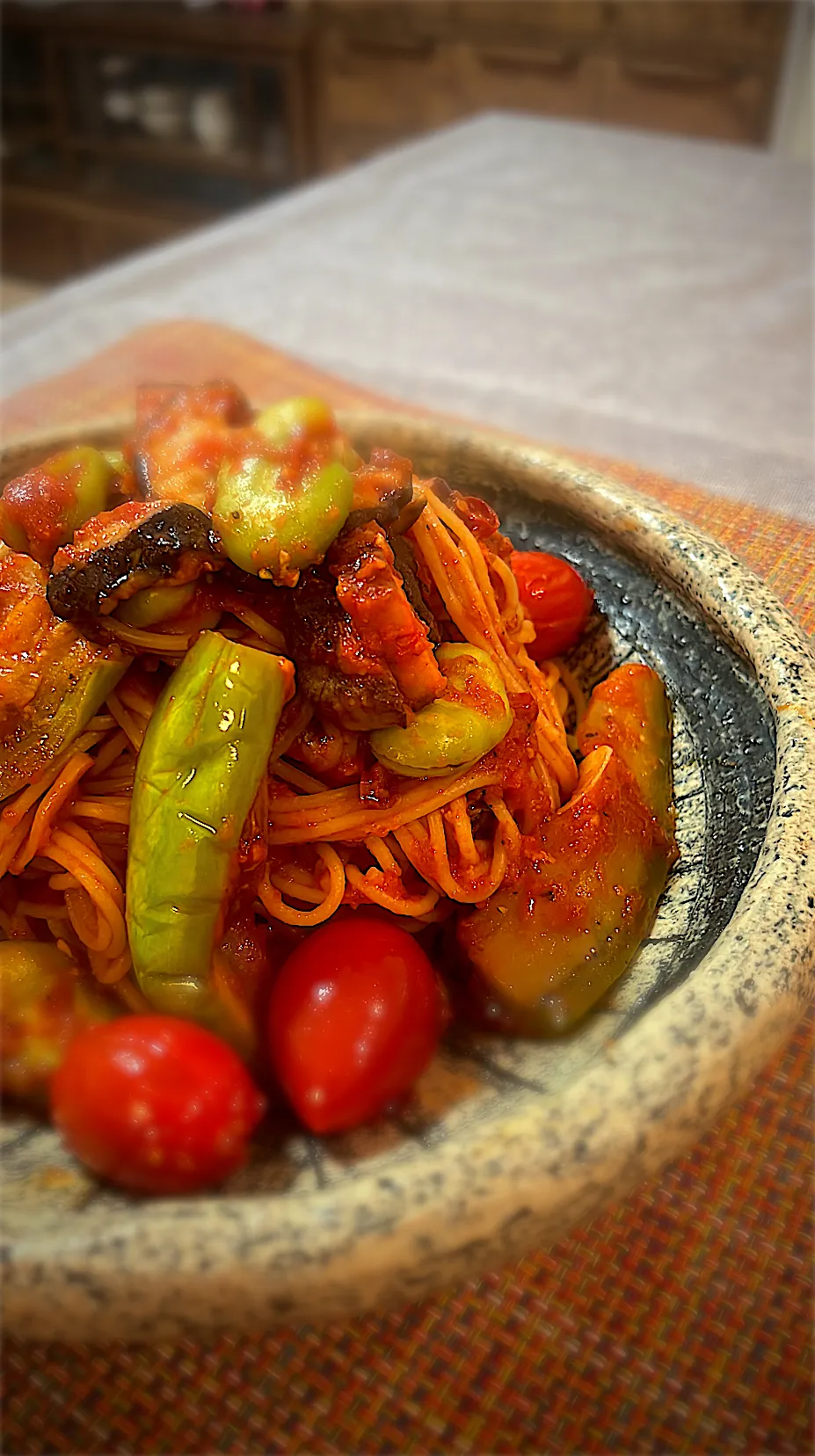 翡翠茄子とそら豆のトマトソースパスタ
