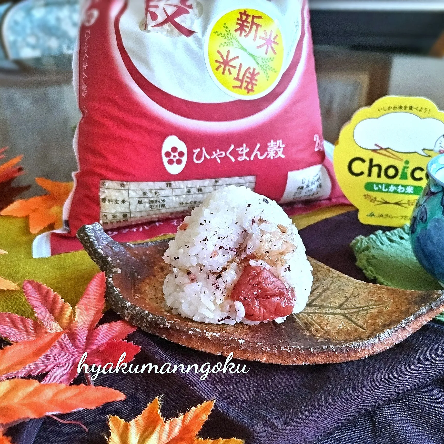 鰹節と梅干しとお友達からいただいた「おにぎりの塩(ゆかり入り🎶)」で♡