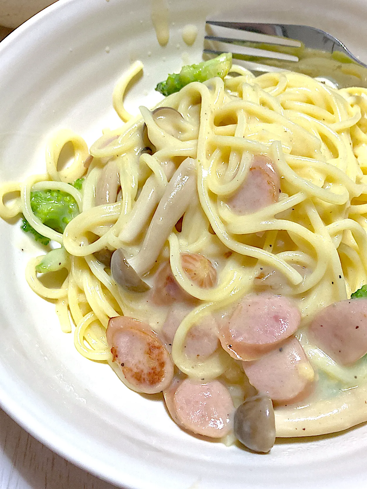 ウインナーとブロッコリーのカルボナーラ、コーンスープ