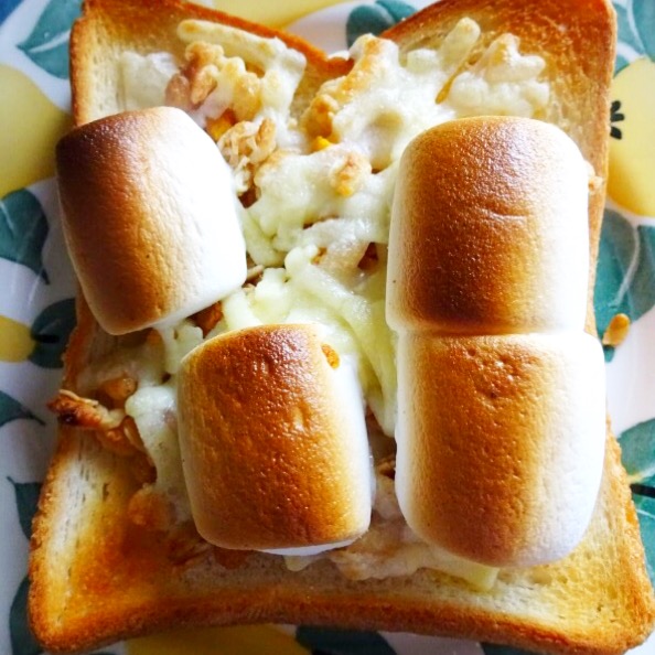 軽く焼いたパンにマシュマロとグラノーラ、溶けるチーズを乗せて再度焼くだけ♪