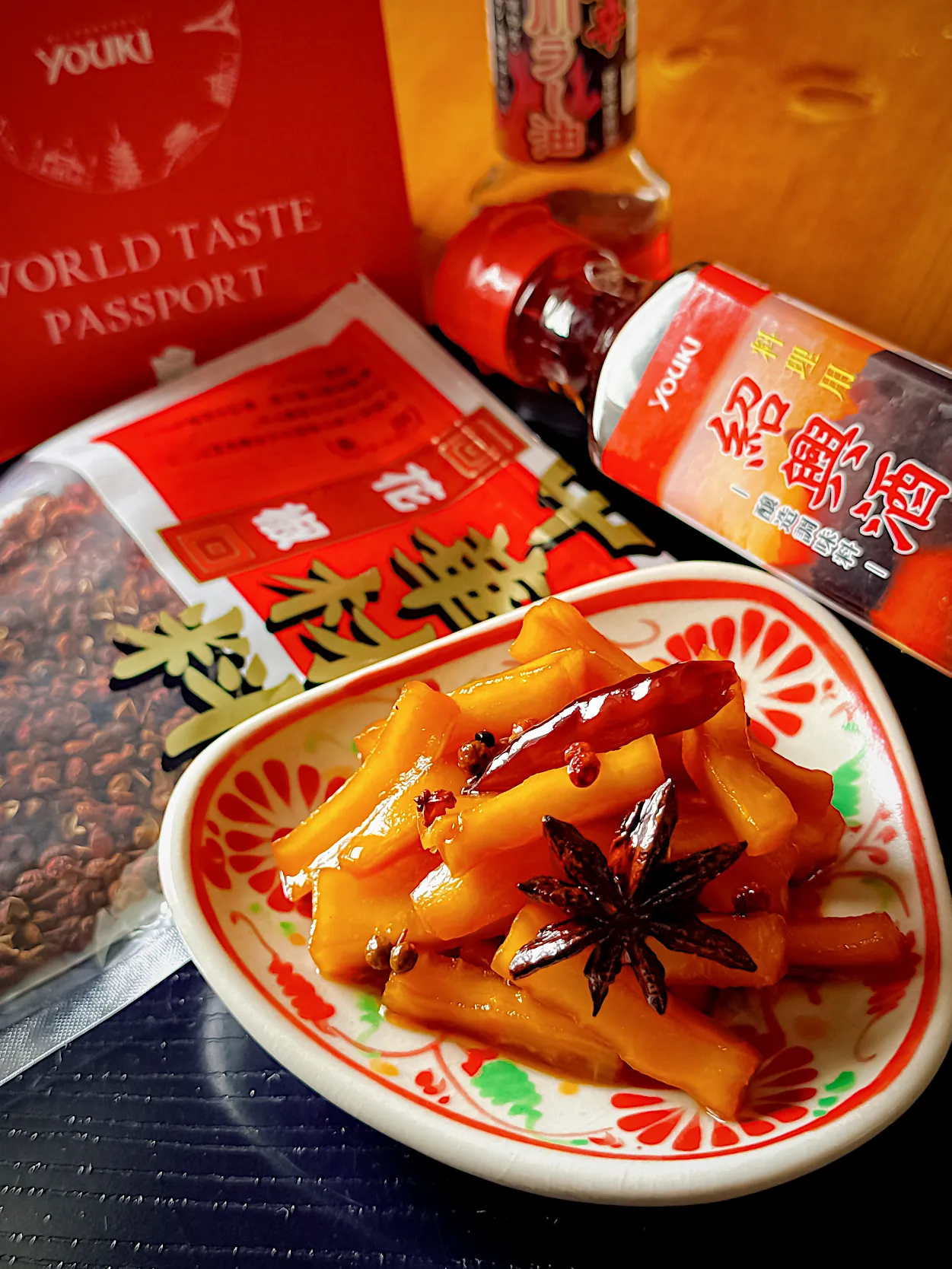 一日寝かせたものを食べてみると、太めの大根のパリポリとした歯応えある食感に#紹興酒 のカラメルのようなコクのある味わいがしーみしみっ(∩ˊ͈ ᢐ ˋ͈ ∩) ジュルル💕またそれが八角のくぐもった甘い香りと相まって堪らないし、後からじわりと忍び寄る花椒の痺れも癖になる(੭ु ›ω‹ )੭ु