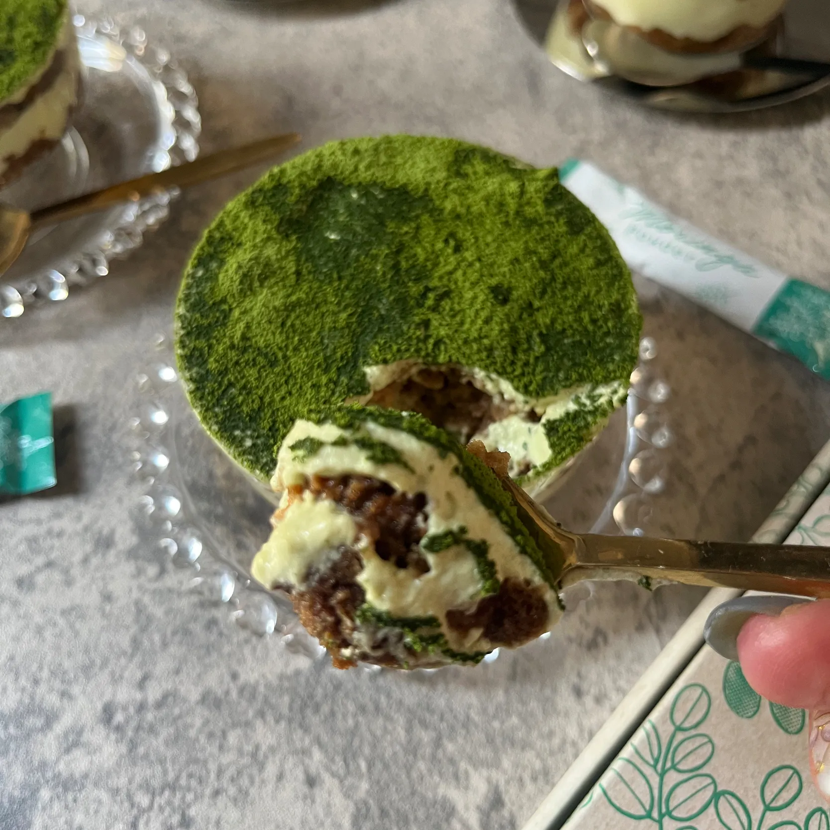 6.スポンジケーキにコーヒーシロップに浸しグラスの底に敷き詰め⑤のクリーム▶️スポンジ▶️クリーム交互に詰めて最後にパウダーをまぶす。