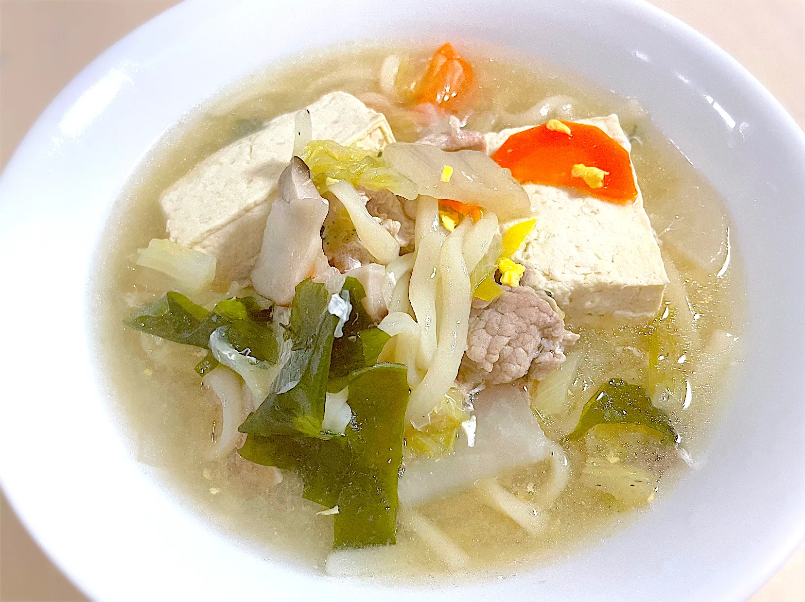 つゆ、昆布、豚肉。大根、にんじん、長ネギ、椎茸、卵、わかめ、豆腐をいれました。