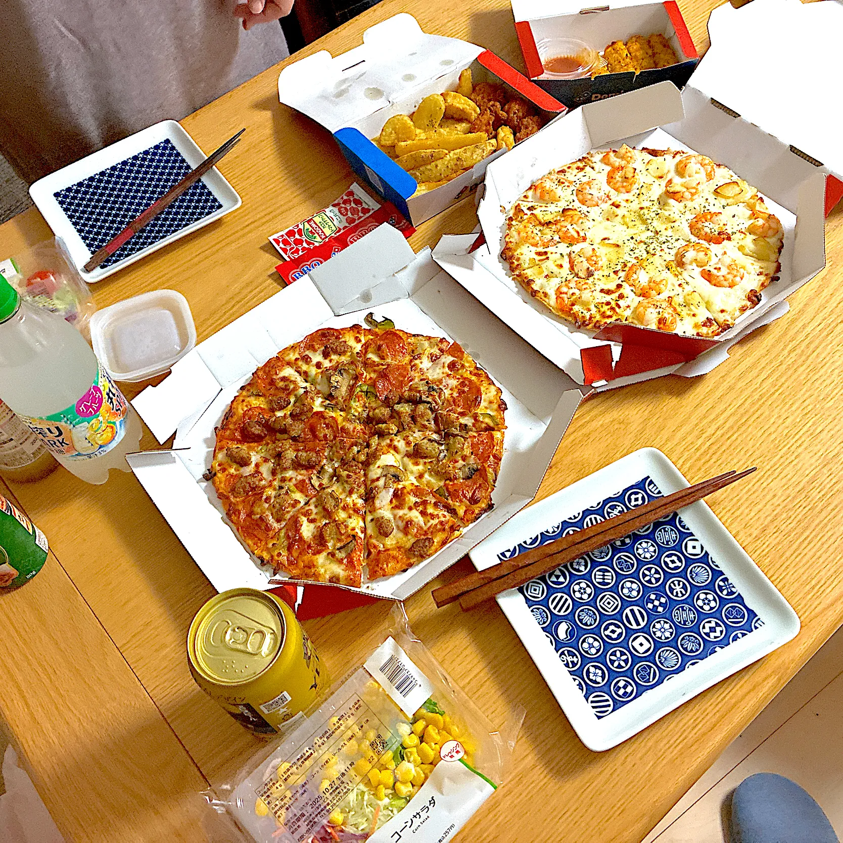 たっぷりドミノデラックス、ガーリックシュリンプ、パーティボックス、のび〜るチーズ棒、ミートソース、コーンサラダ、レモンドレッシングジュレ。