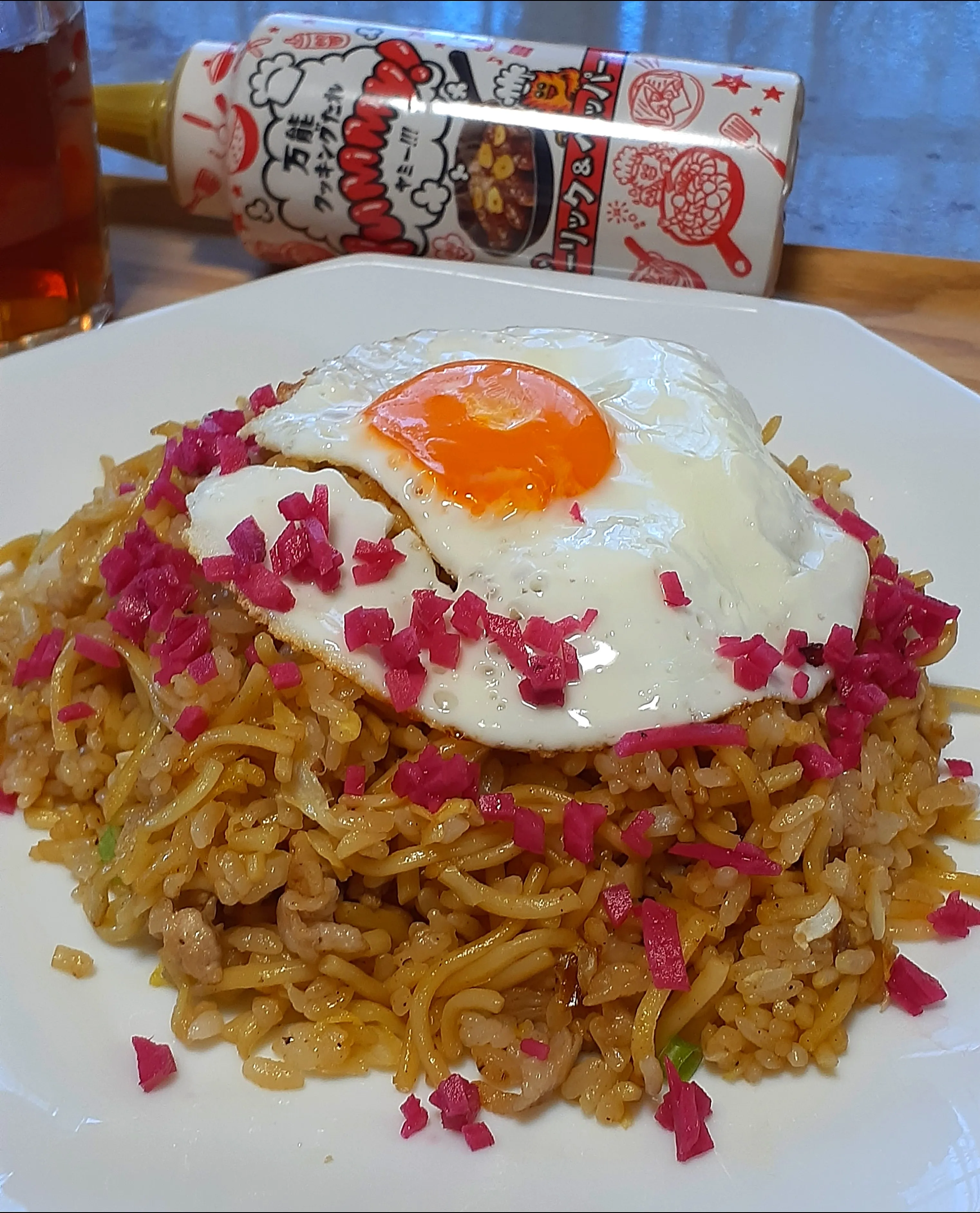 目玉焼きも乗って、刻んだ紅しょうがもトッピングして、色合いが可愛い\(*ˊᗜˋ*)/♡