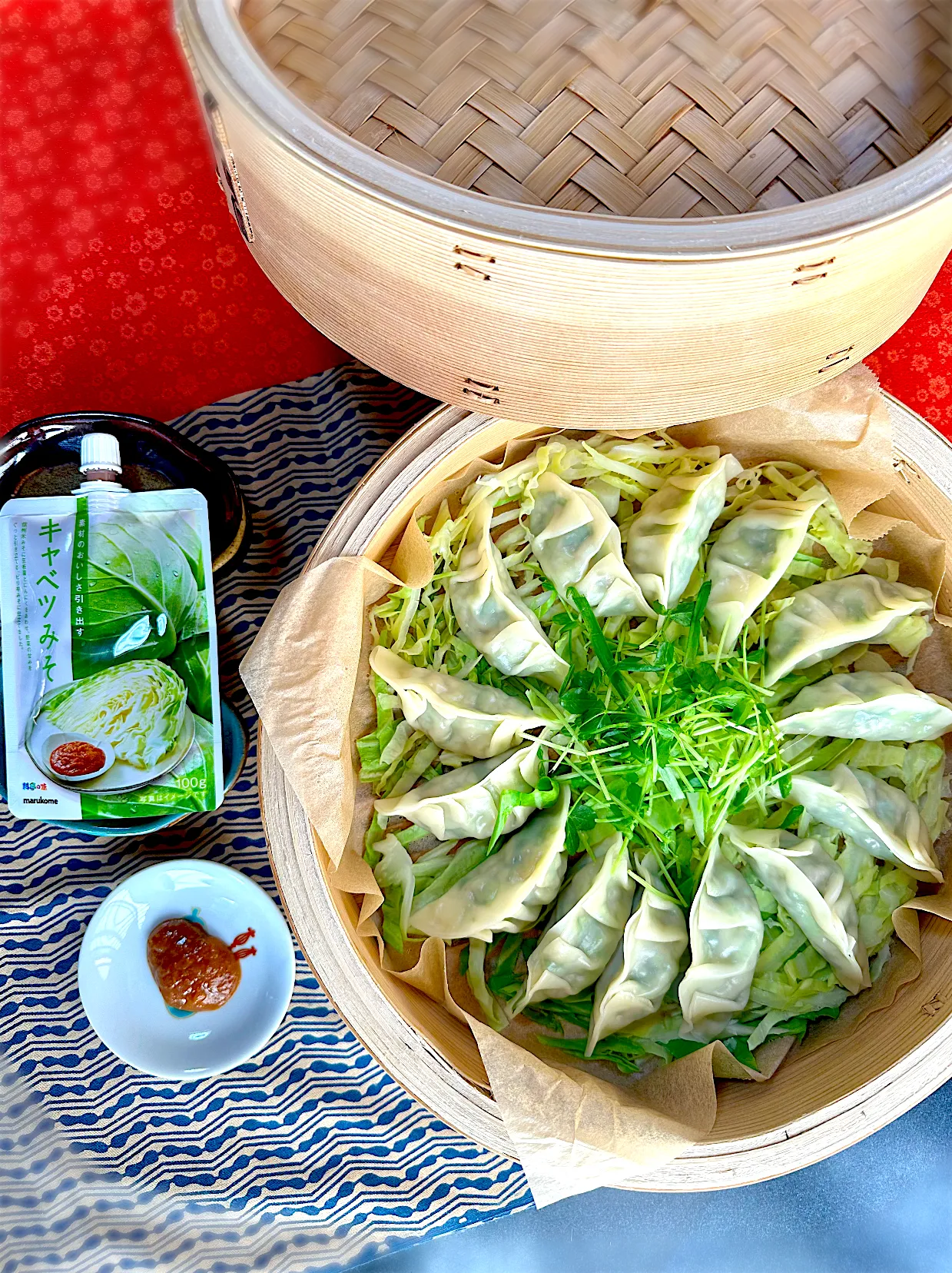 寒くなってきたので、粗い千切キャベツの温野菜&蒸し餃子で。