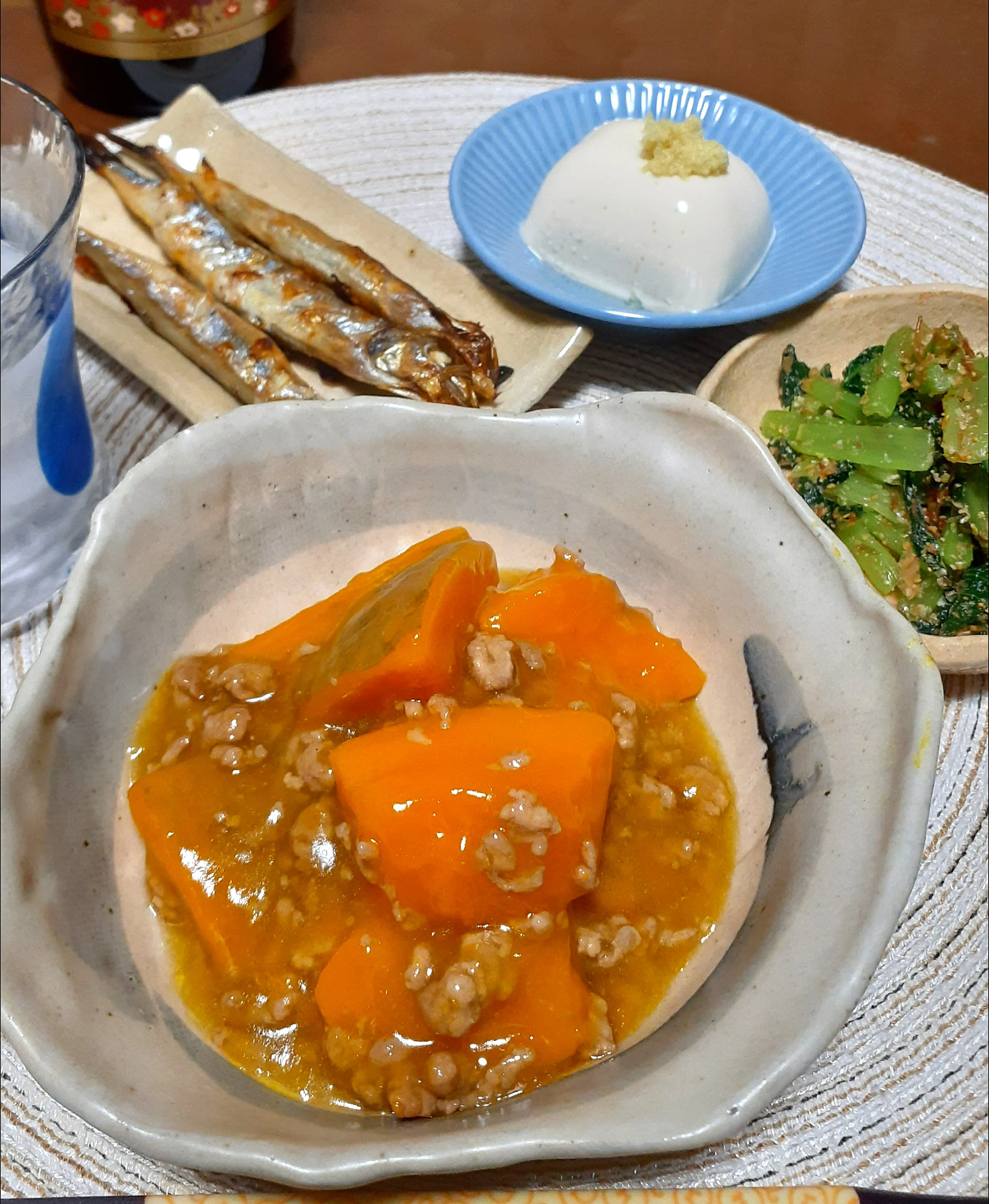 昨日のカボチャの半分をひき肉餡掛けにしたよ🎵