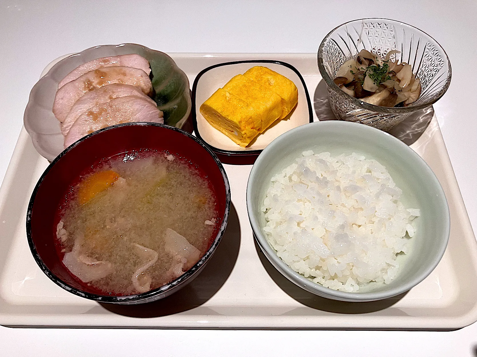 鶏チャーシュー、たまごやき、きのこサラダ、豚汁