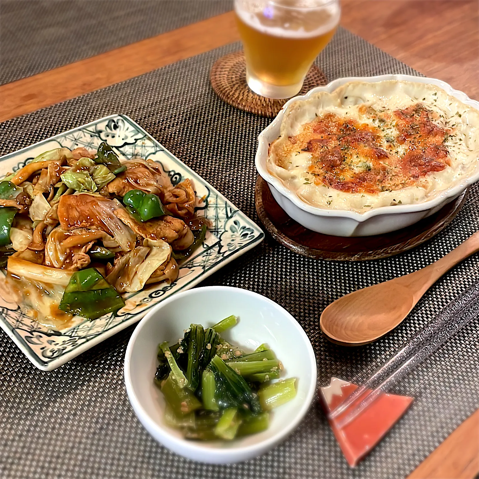 回鍋肉 マカロニグラタン 小松菜のごま和え