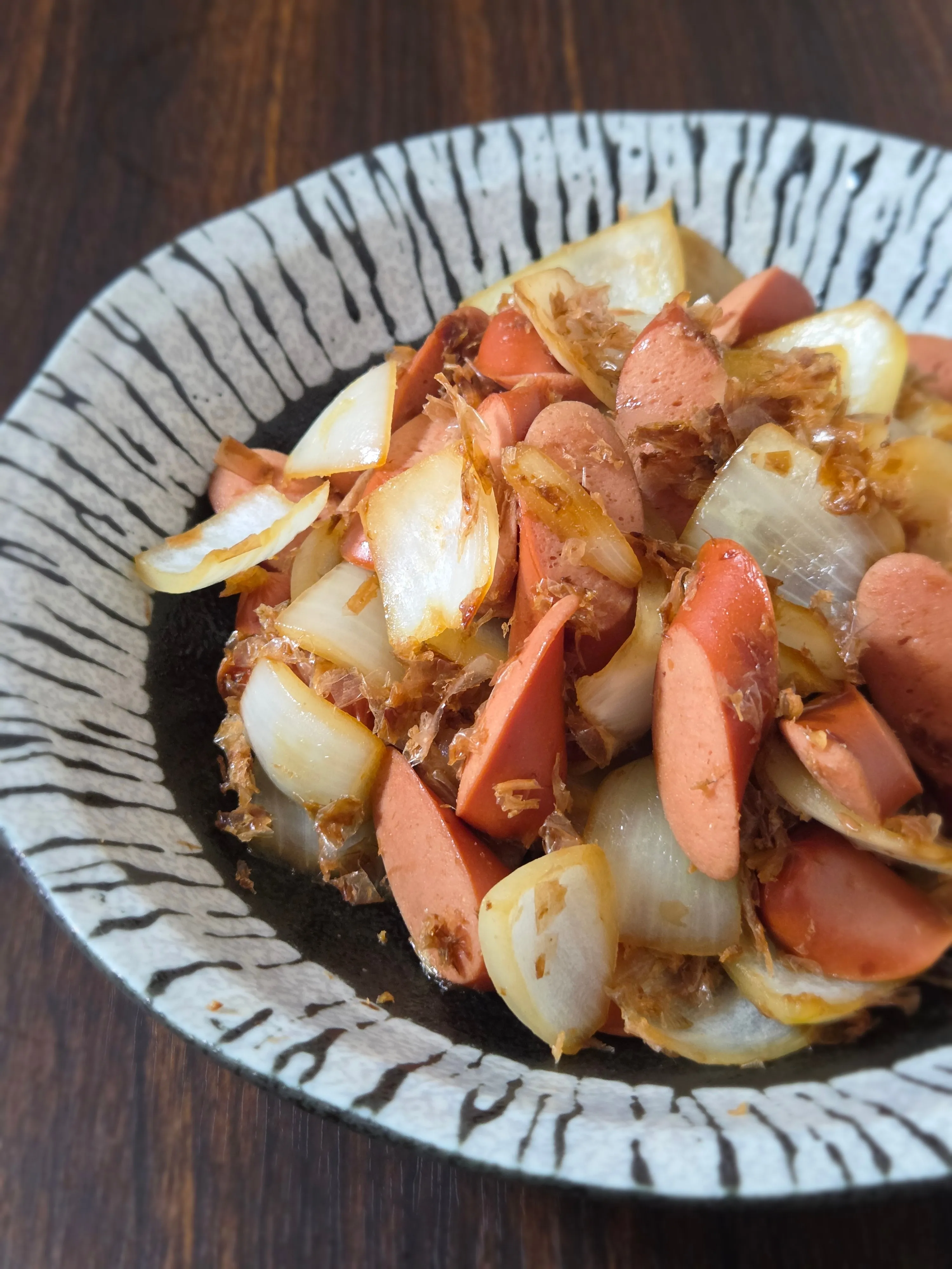 #晩ご飯 #息子作 #ウインナー #玉ねぎ #鰹節 #醤油