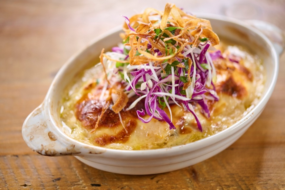 鮭とじゃがいも、カニの旨みを閉じ込めた贅沢なひと皿。米糀ミルクとホワイトソースがやさしくとろけるグラタンは、まろやかでコク深い味わいに仕上がります。