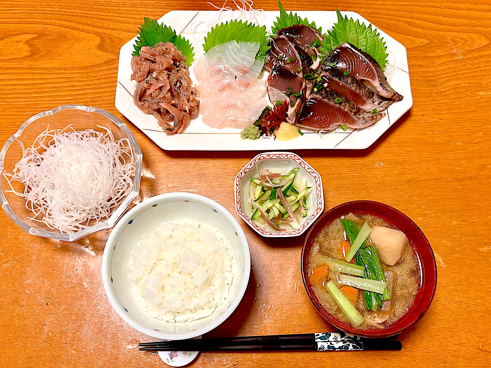 急に寒くなりましたね。なので今夜は #白米 #お刺身 #鰹たたき #真鯛 #鯵なめろう #茗荷と胡瓜の甘酢和え #薩摩汁