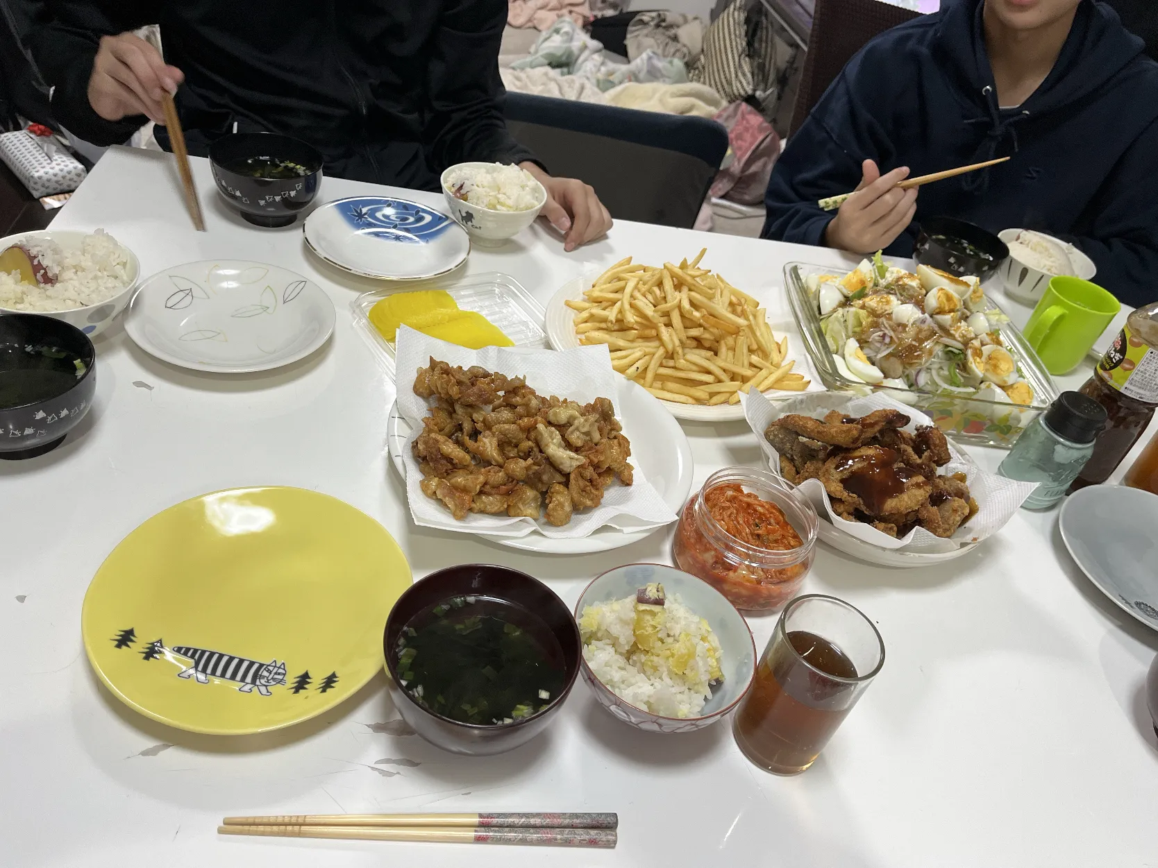 晩御飯☆わかめスープ☆さつま芋ご飯☆サラダ☆鶏皮パリパリ☆ヒレカツ☆フライドポテト
