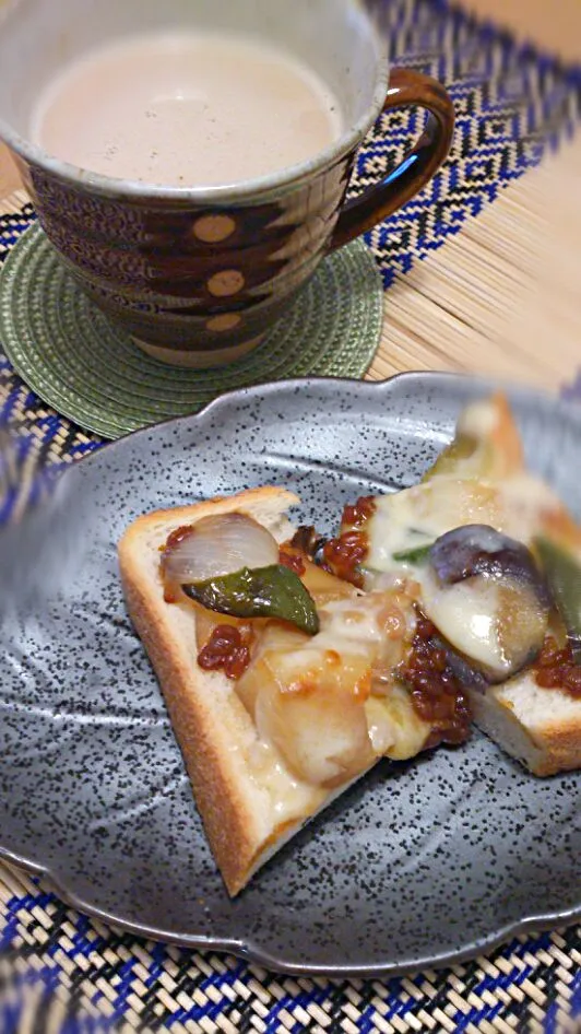 晩ごはんの、茄子とじゃが芋のもろ味噌炒めをパンに乗せてリメイク☆