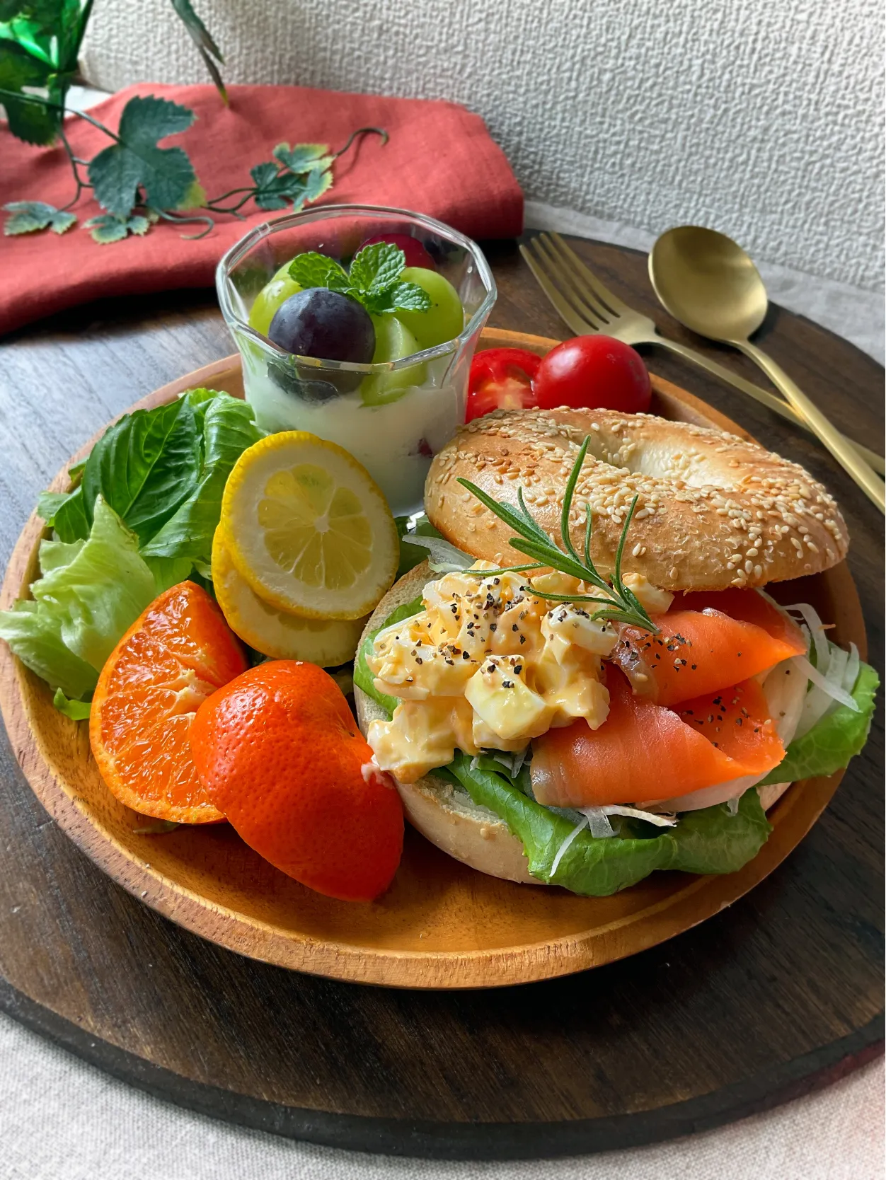 モチモチベーグルにサーモンと卵の組み合わせも合うな…