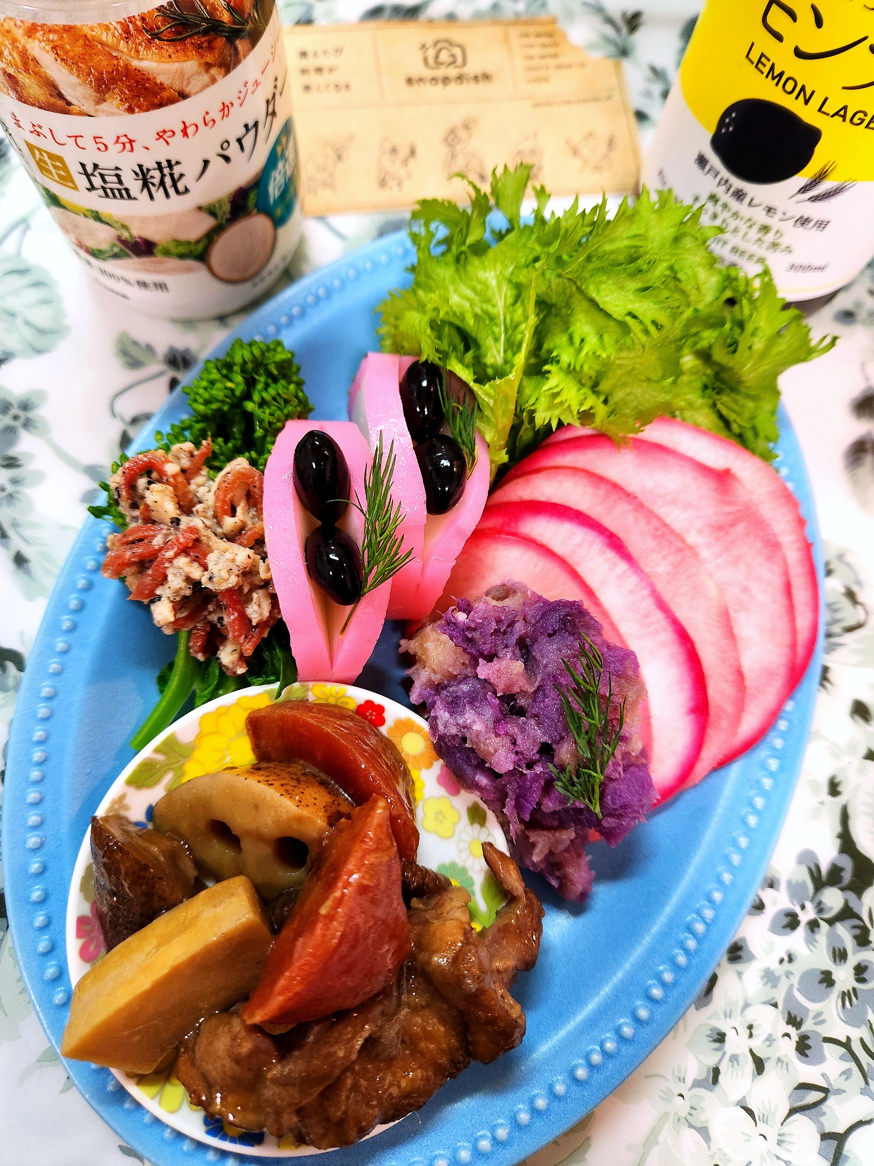 お節が洋風のなんか素敵なワンプレートになってるじゃん😋ディルがのってるあたりがきなちゃんらしいワンプレートお節だよ👍 ̖́-
