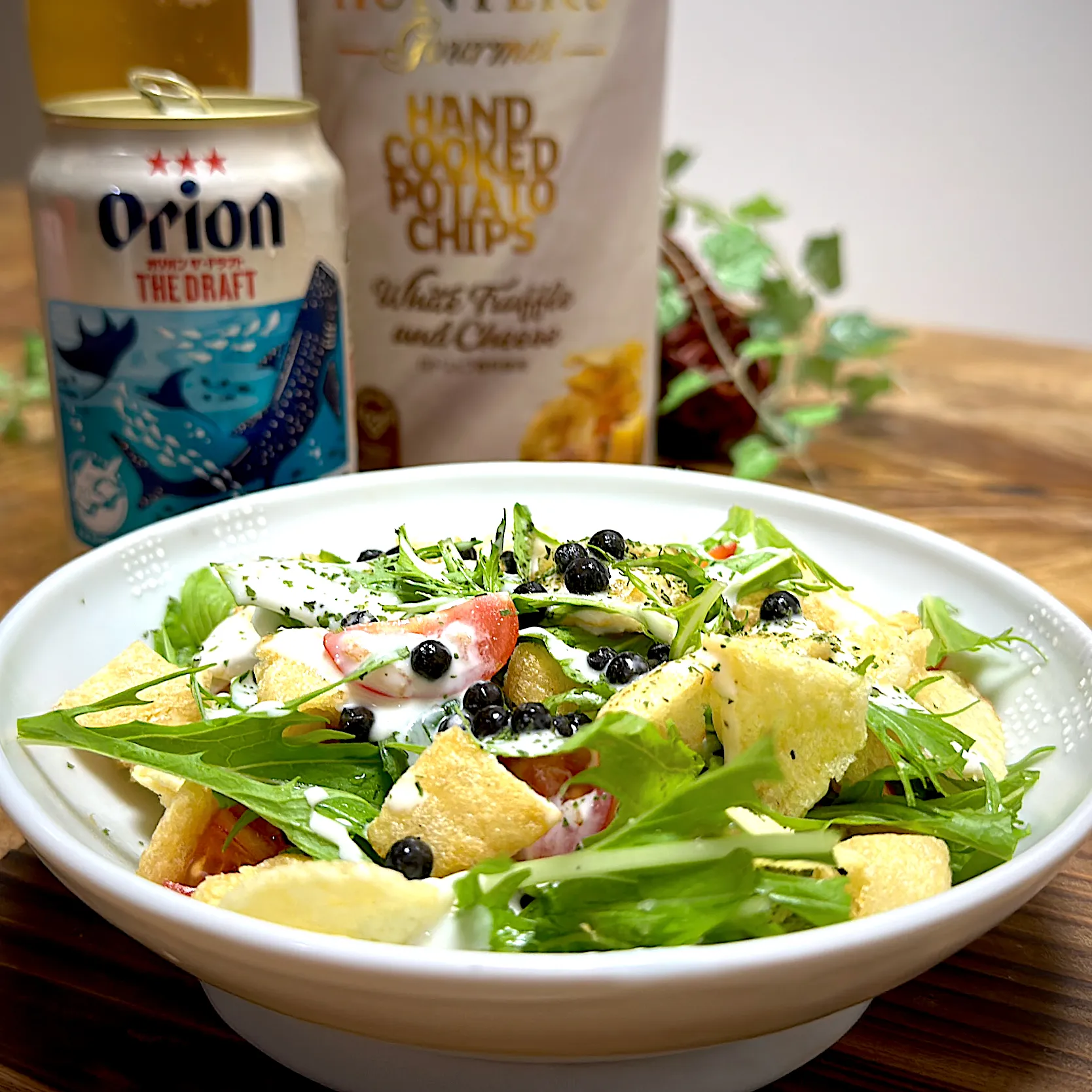 水菜にトマト、カリカリに焼いた薄揚げと白トリュフチップス、生黒胡椒にシーザーサラダドレッシングをかけて。美ら海水族館ラベルのオリオンビール。イ〜ヤ〜サッサ〜。白トリュフチップスがクセになる。やめられない止まらない。あ〜やばい。お疲れ様でした♪