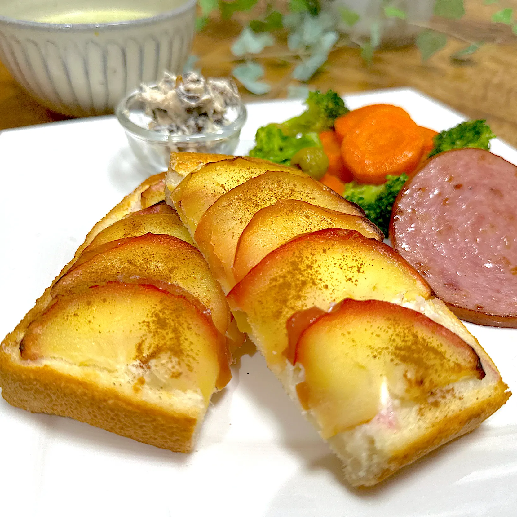 スライスしたリンゴをレンチンでコンポートに。クリームチーズを塗ったパンに並べて焼いて、シナモンパラパラ。酸味が心地よいトーストできました!ブロッコリー、にんじん、オリーブでアヒージョ。ハムも焼いてみました。柿のクリームチーズ和えも再び。ブロッコリーの茎はスープに。