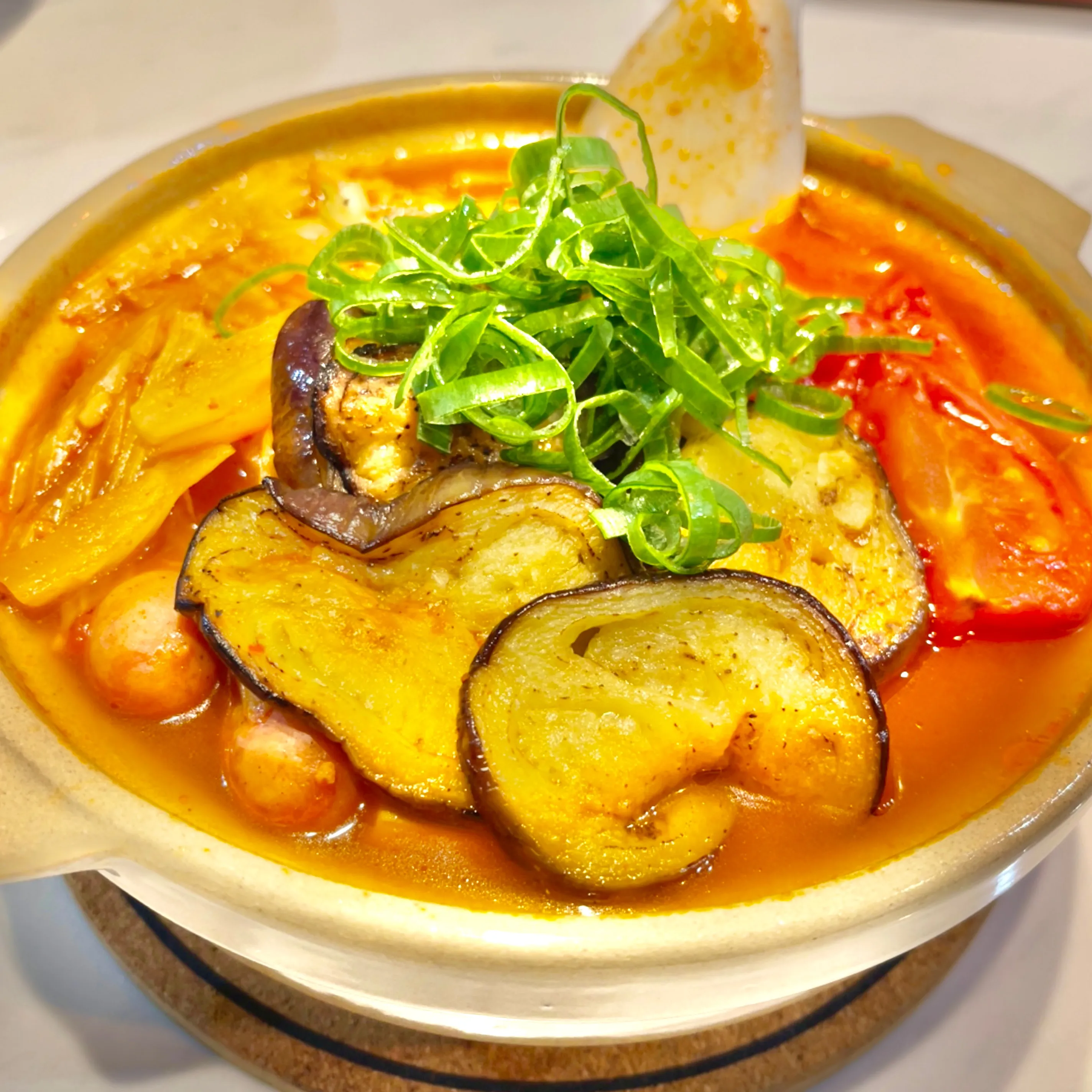 #妻用 #鍋 #トマトチリ #白菜 #豆腐 #ウィンナー #白ねぎ #セロリ #茄子 #トマト #しめじ